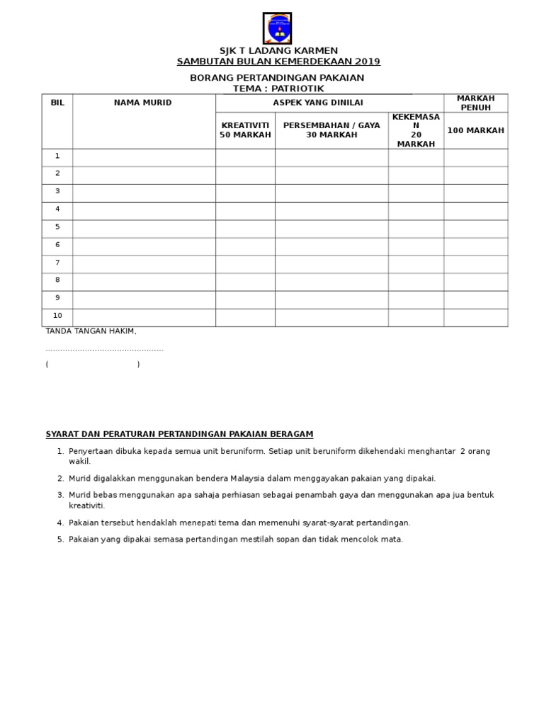 Borang Markah Dan Syarat Pertandingan Pakaian Beragam Doc