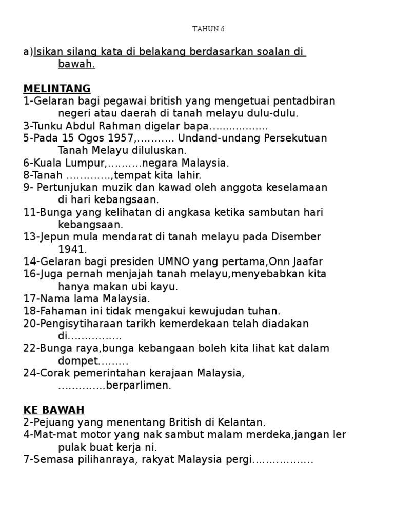 Soalan Teka Silang Kata Kemerdekaan