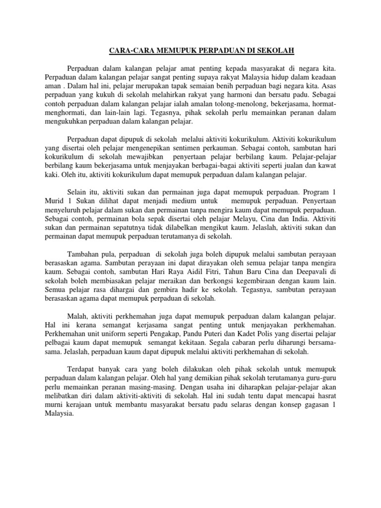 Karangan Cara Cara Memupuk Semangat Perpaduan Dalam Kalangan Pelajar