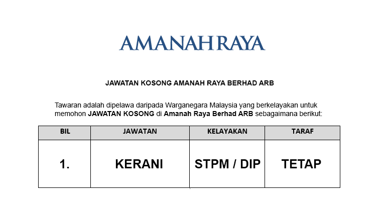 Amanah Raya Berhad Arb Jawatan Kosong Kerani Dibuka Jobcari Com Jawatan Kosong Terkini